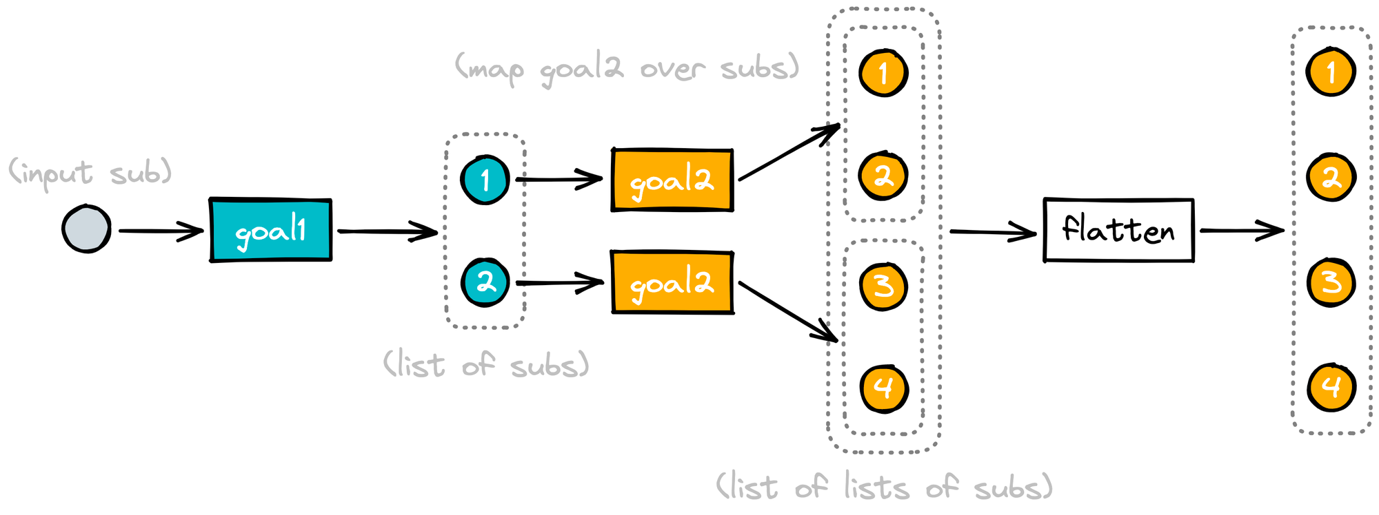 The circles are substitutions, the boxes with solid borders are functions, and the dashed boxes are lists. Colors indicate a goal or substitutions generated by the goal with matching color. Numbers indicate unique substitutions with a given color. In this illustrative example, I assume that each of the goals generates two substitutions.